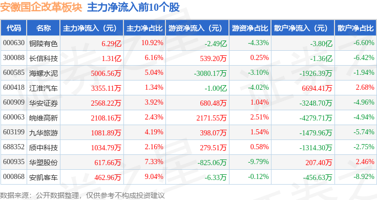 从资金流向上来看,当日安徽国企改革板块主力资金净流入3.54亿元,游资资金净流出4.02亿元,散户资金净流入4768.45万元。安徽国企改革板块个股资金流向见下表: