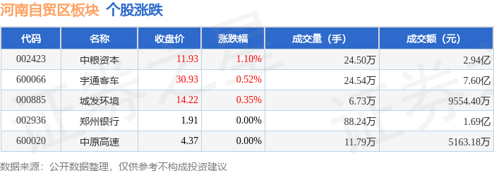 证券之星消息,1月23日河南自贸区板块较上一交易日上涨0.54%,中粮资本领涨。当日上证指数报收于4136.16,上涨0.33%。深证成指报收于14439.66,上涨0.79%。河南自贸区板块个股涨跌见下表: