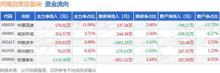 从资金流向上来看,当日河南自贸区板块主力资金净流出863.91万元,游资资金净流入951.71万元,散户资金净流出87.8万元。河南自贸区板块个股资金流向见下表: