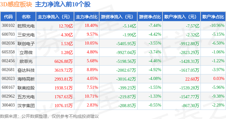 从资金流向上来看,当日3D感应板块主力资金净流入10.05亿元,游资资金净流出9.89亿元,散户资金净流出1537.26万元。3D感应板块个股资金流向见下表: