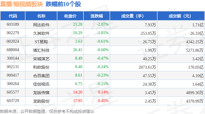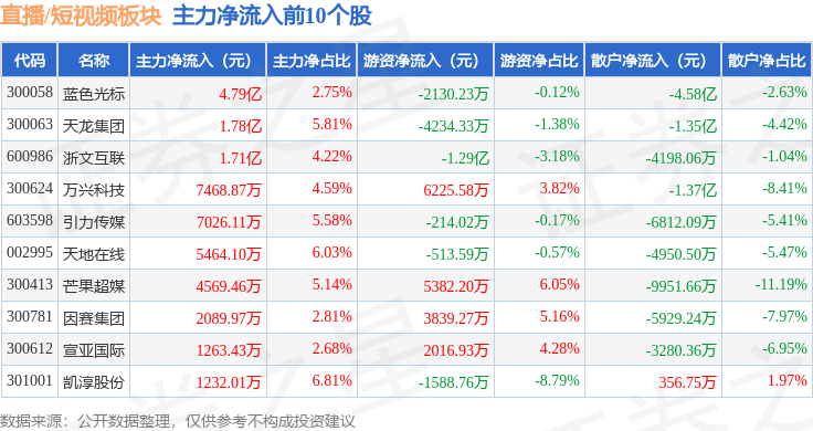 从资金流向上来看,当日直播/短视频板块主力资金净流出23.66亿元,游资资金净流入9.05亿元,散户资金净流入14.61亿元。直播/短视频板块个股资金流向见下表: