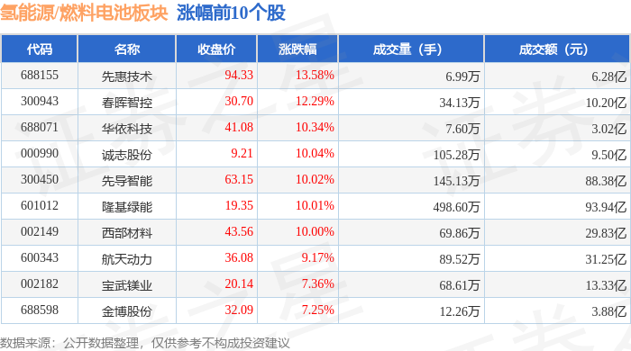 从资金流向上来看,当日氢能源/燃料电池板块主力资金净流出6.35亿元,游资资金净流出29.38亿元,散户资金净流入35.73亿元。氢能源/燃料电池板块个股资金流向见下表: