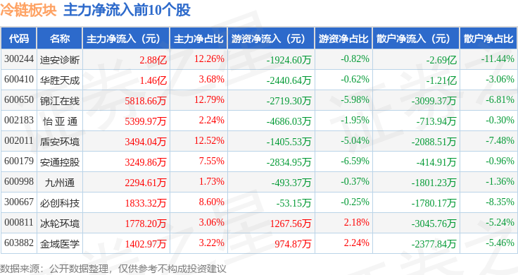 从资金流向上来看,当日冷链板块主力资金净流出13.11亿元,游资资金净流出2.4亿元,散户资金净流入15.51亿元。冷链板块个股资金流向见下表: