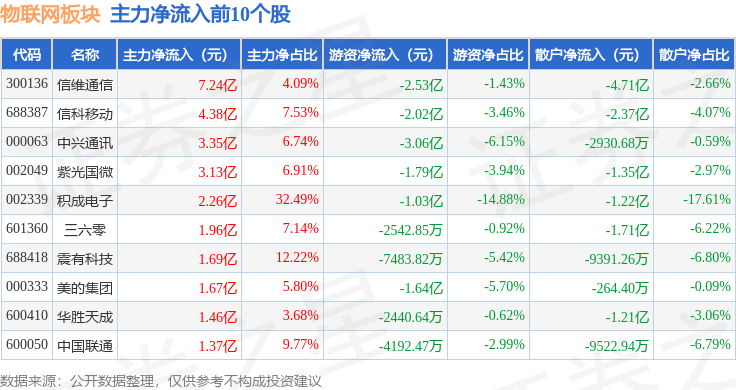 从资金流向上来看,当日物联网板块主力资金净流出38.38亿元,游资资金净流出12.88亿元,散户资金净流入51.26亿元。物联网板块个股资金流向见下表: