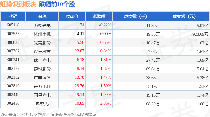 证券之星消息,1月23日虹膜识别板块较上一交易日上涨8.57%,蓝思科技领涨。当日上证指数报收于4136.16,上涨0.33%。深证成指报收于14439.66,上涨0.79%。虹膜识别板块个股涨跌见下表: