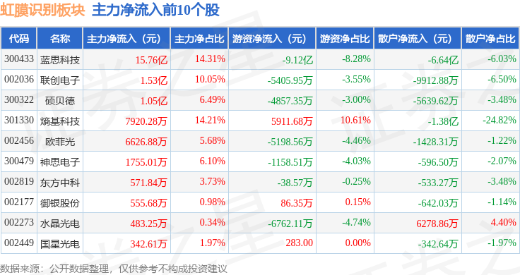 从资金流向上来看,当日虹膜识别板块主力资金净流入19.6亿元,游资资金净流出11.18亿元,散户资金净流出8.42亿元。虹膜识别板块个股资金流向见下表: