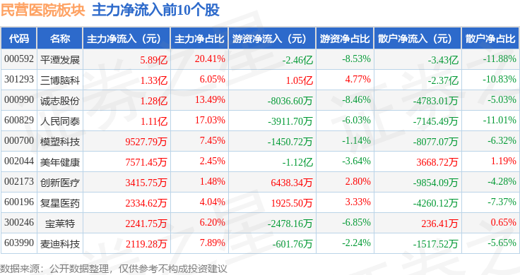 从资金流向上来看,当日民营医院板块主力资金净流入8.4亿元,游资资金净流出4.34亿元,散户资金净流出4.06亿元。民营医院板块个股资金流向见下表: