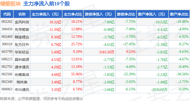 从资金流向上来看,当日储能板块主力资金净流出8.71亿元,游资资金净流出41.84亿元,散户资金净流入50.55亿元。储能板块个股资金流向见下表: