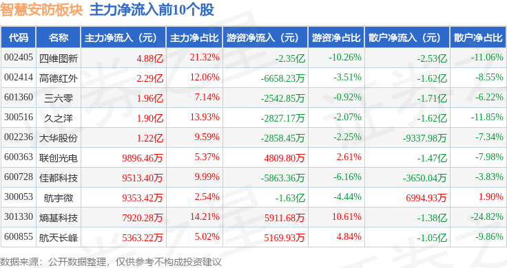 从资金流向上来看,当日智慧安防板块主力资金净流入12.91亿元,游资资金净流出11.07亿元,散户资金净流出1.84亿元。智慧安防板块个股资金流向见下表: