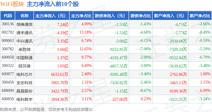 从资金流向上来看,当日WiFi板块主力资金净流入6.21亿元,游资资金净流出11.46亿元,散户资金净流入5.25亿元。WiFi板块个股资金流向见下表: