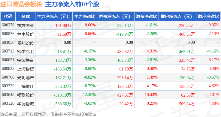 从资金流向上来看,当日进口博览会板块主力资金净流出5574.56万元,游资资金净流入1041.87万元,散户资金净流入4532.68万元。进口博览会板块个股资金流向见下表: