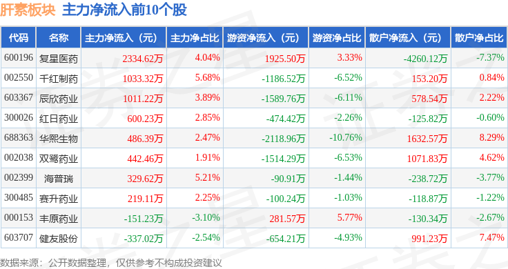 从资金流向上来看,当日肝素板块主力资金净流出3963.63万元,游资资金净流出5352.69万元,散户资金净流入9316.32万元。肝素板块个股资金流向见下表: