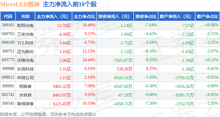从资金流向上来看,当日MicroLED板块主力资金净流入28.17亿元,游资资金净流出16.12亿元,散户资金净流出12.05亿元。MicroLED板块个股资金流向见下表: