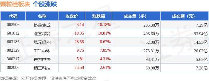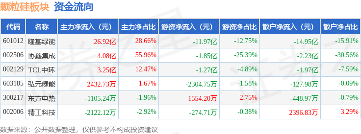 从资金流向上来看,当日颗粒硅板块主力资金净流入34.17亿元,游资资金净流出15.2亿元,散户资金净流出18.97亿元。颗粒硅板块个股资金流向见下表: