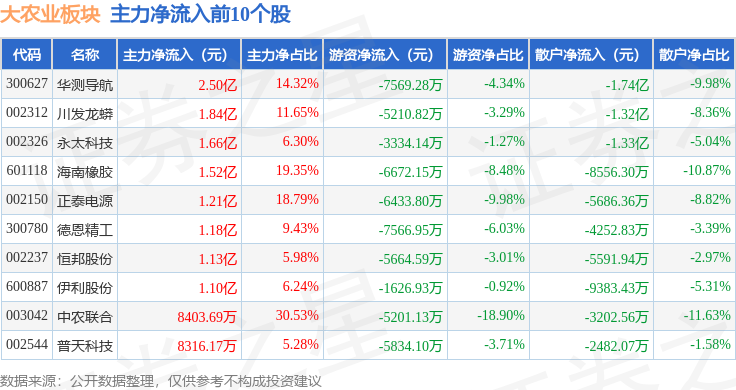 从资金流向上来看,当日大农业板块主力资金净流出36.58亿元,游资资金净流入3.2亿元,散户资金净流入33.38亿元。大农业板块个股资金流向见下表: