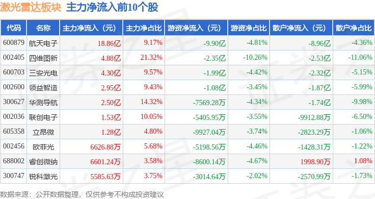 从资金流向上来看,当日激光雷达板块主力资金净流出57.88亿元,游资资金净流入34.75亿元,散户资金净流入23.12亿元。激光雷达板块个股资金流向见下表: