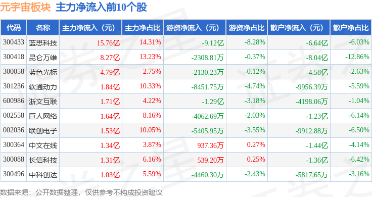 从资金流向上来看,当日元宇宙板块主力资金净流入37.28亿元,游资资金净流出16.34亿元,散户资金净流出20.93亿元。元宇宙板块个股资金流向见下表: