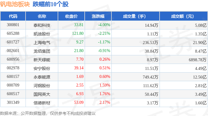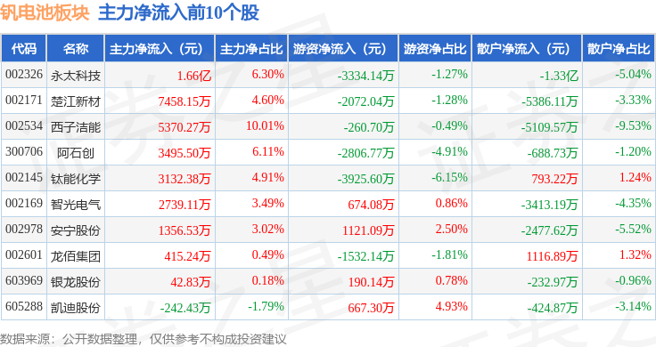 从资金流向上来看,当日钒电池板块主力资金净流出6176.9万元,游资资金净流入1384.12万元,散户资金净流入4792.78万元。钒电池板块个股资金流向见下表:
