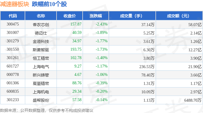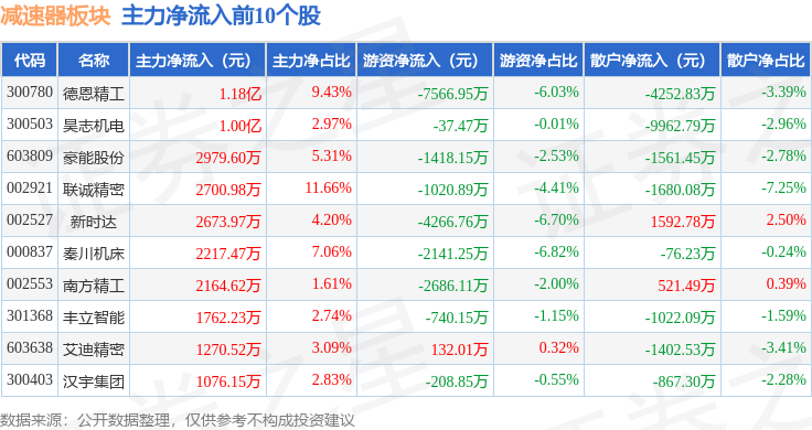 从资金流向上来看,当日减速器板块主力资金净流出15.54亿元,游资资金净流入1.88亿元,散户资金净流入13.66亿元。减速器板块个股资金流向见下表: