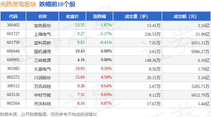证券之星消息,1月23日光热发电板块较上一交易日上涨0.8%,武进不锈领涨。当日上证指数报收于4136.16,上涨0.33%。深证成指报收于14439.66,上涨0.79%。光热发电板块个股涨跌见下表: