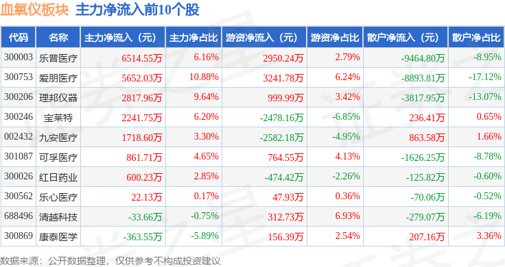 从资金流向上来看,当日血氧仪板块主力资金净流入1.32亿元,游资资金净流入1526.02万元,散户资金净流出1.48亿元。血氧仪板块个股资金流向见下表: