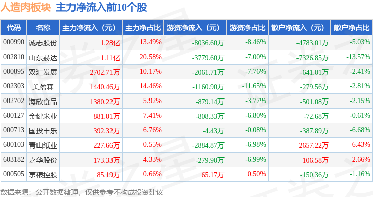 从资金流向上来看,当日人造肉板块主力资金净流入4134.99万元,游资资金净流出1.36亿元,散户资金净流入9437.02万元。人造肉板块个股资金流向见下表: