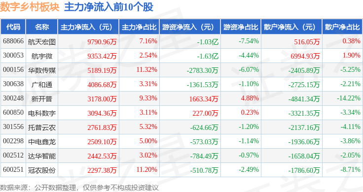 从资金流向上来看,当日数字乡村板块主力资金净流出1.66亿元,游资资金净流出5.08亿元,散户资金净流入6.74亿元。数字乡村板块个股资金流向见下表: