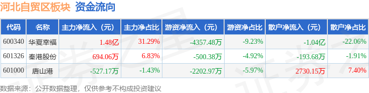 从资金流向上来看,当日河北自贸区板块主力资金净流入1.49亿元,游资资金净流出7060.84万元,散户资金净流出7876.17万元。河北自贸区板块个股资金流向见下表: