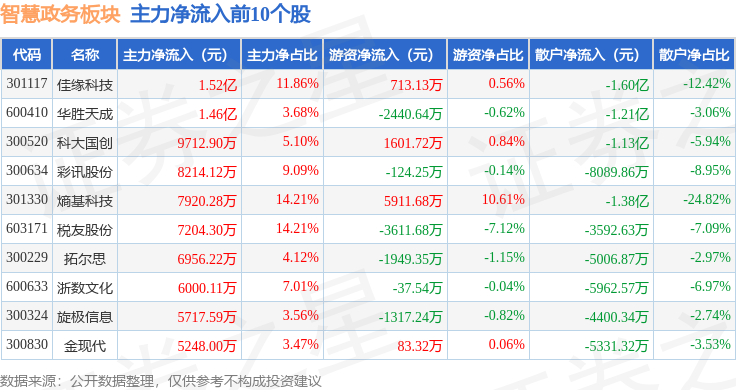 从资金流向上来看,当日智慧政务板块主力资金净流出5.61亿元,游资资金净流出2.28亿元,散户资金净流入7.9亿元。智慧政务板块个股资金流向见下表: