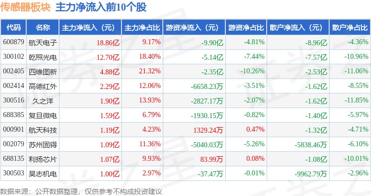 从资金流向上来看,当日传感器板块主力资金净流入12.33亿元,游资资金净流出14.15亿元,散户资金净流入1.82亿元。传感器板块个股资金流向见下表:
