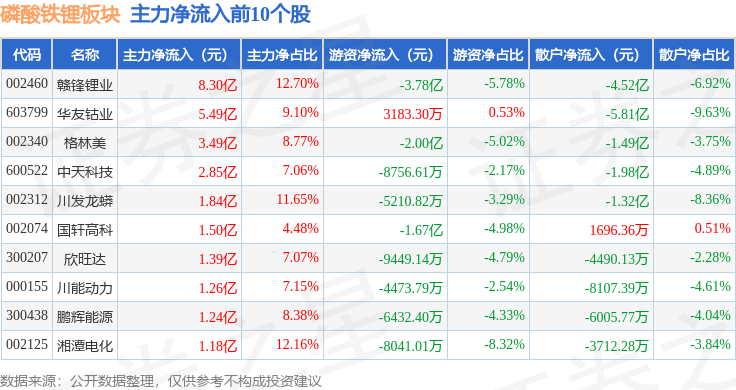 从资金流向上来看,当日磷酸铁锂板块主力资金净流入16.11亿元,游资资金净流出17.8亿元,散户资金净流入1.69亿元。磷酸铁锂板块个股资金流向见下表: