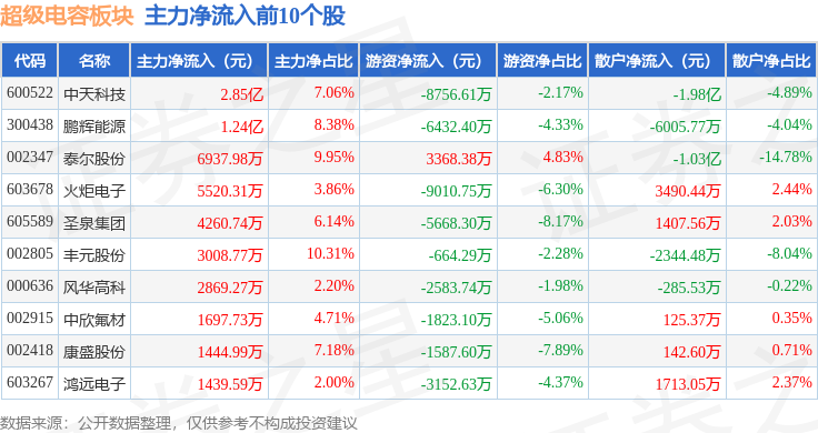 从资金流向上来看,当日超级电容板块主力资金净流出2.69亿元,游资资金净流出6.02亿元,散户资金净流入8.7亿元。超级电容板块个股资金流向见下表: