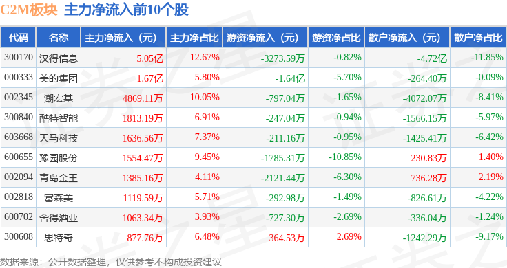 从资金流向上来看,当日C2M板块主力资金净流入3.52亿元,游资资金净流出2.11亿元,散户资金净流出1.41亿元。C2M板块个股资金流向见下表: