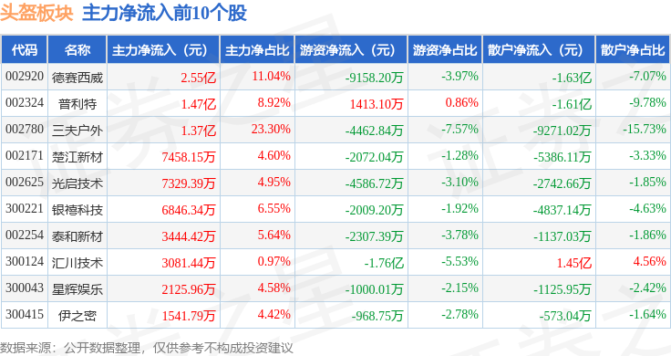 从资金流向上来看,当日头盔板块主力资金净流入4.15亿元,游资资金净流出4.42亿元,散户资金净流入2671.98万元。头盔板块个股资金流向见下表: