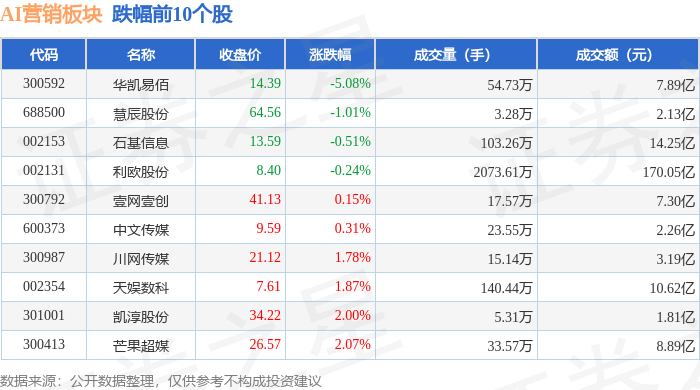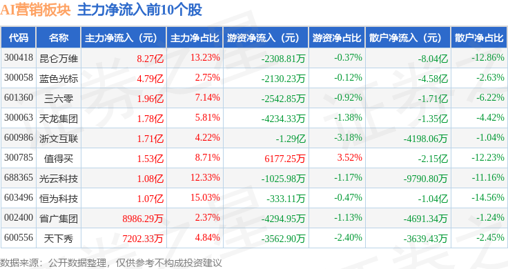 从资金流向上来看,当日AI营销板块主力资金净流出4.56亿元,游资资金净流入8.24亿元,散户资金净流出3.67亿元。AI营销板块个股资金流向见下表: