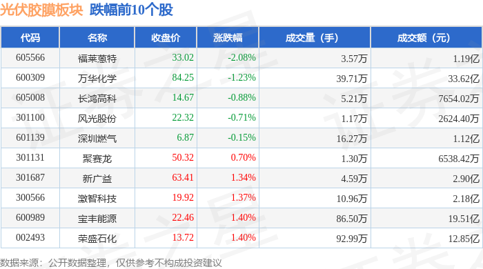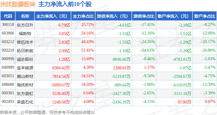 从资金流向上来看,当日光伏胶膜板块主力资金净流入19.59亿元,游资资金净流出9.96亿元,散户资金净流出9.64亿元。光伏胶膜板块个股资金流向见下表: