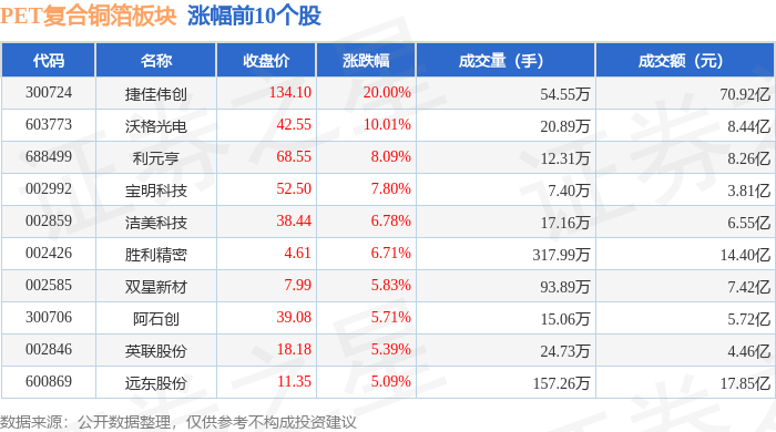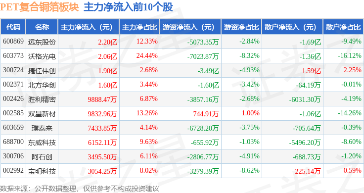 从资金流向上来看,当日PET复合铜箔板块主力资金净流入4.54亿元,游资资金净流出6.63亿元,散户资金净流入2.09亿元。PET复合铜箔板块个股资金流向见下表: