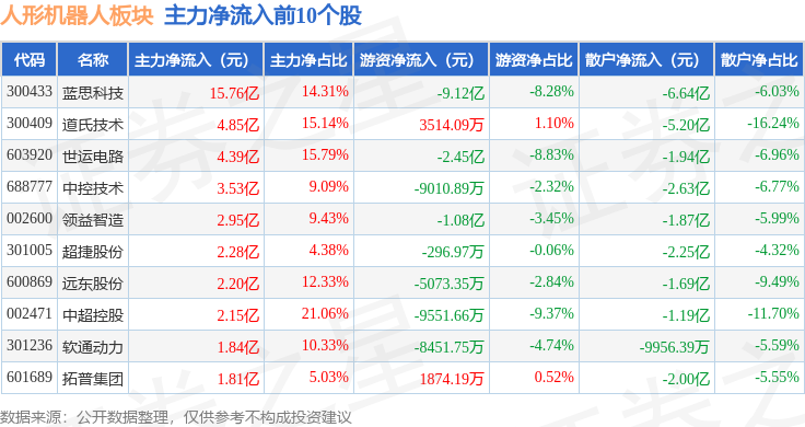 从资金流向上来看,当日人形机器人板块主力资金净流出17.65亿元,游资资金净流出19.52亿元,散户资金净流入37.17亿元。人形机器人板块个股资金流向见下表: