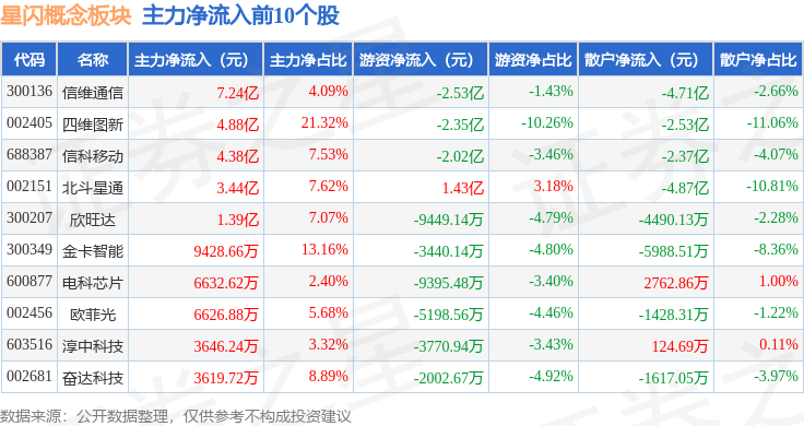 从资金流向上来看,当日星闪概念板块主力资金净流入18.02亿元,游资资金净流出9.11亿元,散户资金净流出8.92亿元。星闪概念板块个股资金流向见下表: