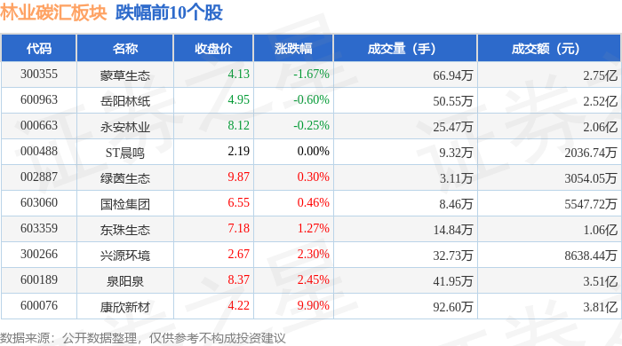 证券之星消息,1月23日林业碳汇板块较上一交易日上涨1.96%,福建金森领涨。当日上证指数报收于4136.16,上涨0.33%。深证成指报收于14439.66,上涨0.79%。林业碳汇板块个股涨跌见下表: