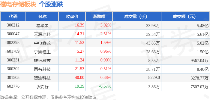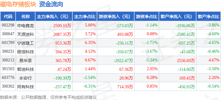 从资金流向上来看,当日磁电存储板块主力资金净流入5909.32万元,游资资金净流出2806.48万元,散户资金净流出3102.84万元。磁电存储板块个股资金流向见下表: