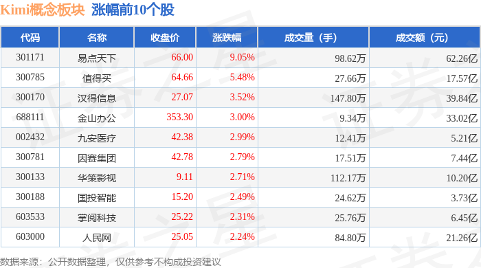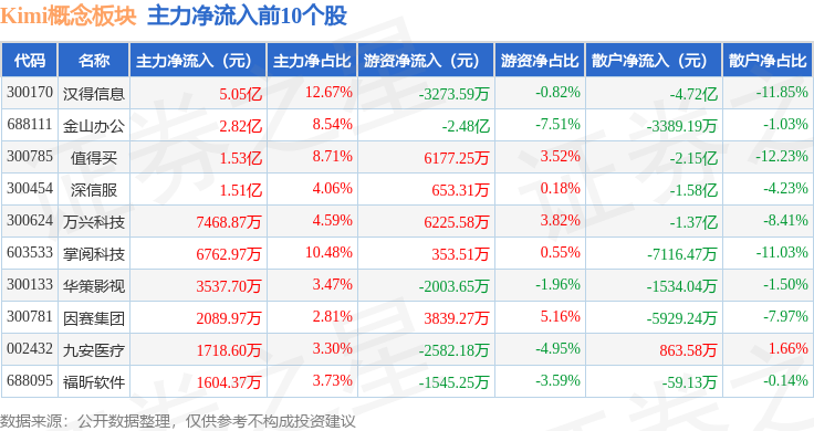 从资金流向上来看,当日Kimi概念板块主力资金净流入12.33亿元,游资资金净流出9823.67万元,散户资金净流出11.35亿元。Kimi概念板块个股资金流向见下表: