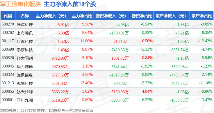 从资金流向上来看,当日军工信息化板块主力资金净流入10.83亿元,游资资金净流出6.79亿元,散户资金净流出4.04亿元。军工信息化板块个股资金流向见下表: