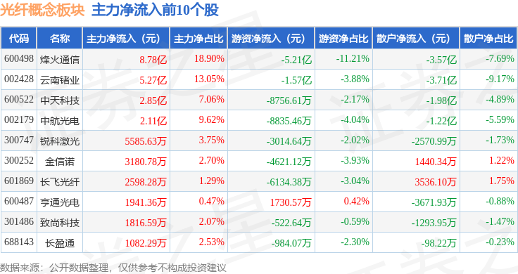 从资金流向上来看,当日光纤概念板块主力资金净流入6.52亿元,游资资金净流出9.16亿元,散户资金净流入2.65亿元。光纤概念板块个股资金流向见下表: