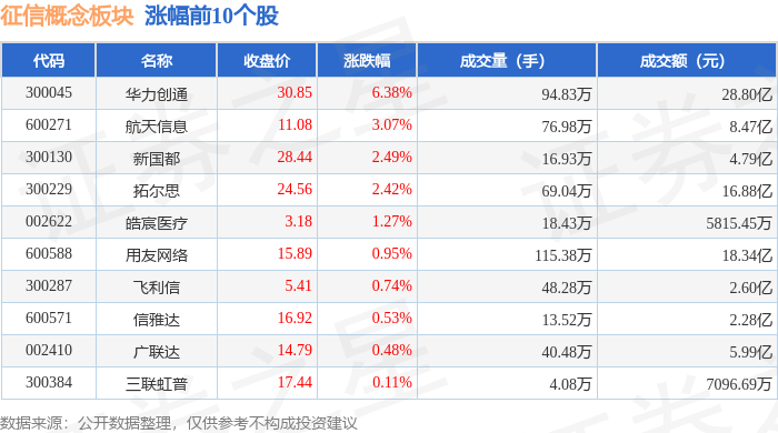 证券之星消息,1月23日征信概念板块较上一交易日上涨1.46%,华力创通领涨。当日上证指数报收于4136.16,上涨0.33%。深证成指报收于14439.66,上涨0.79%。征信概念板块个股涨跌见下表: