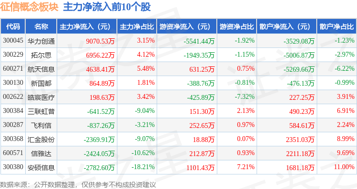从资金流向上来看,当日征信概念板块主力资金净流出9162.5万元,游资资金净流出1.18亿元,散户资金净流入2.09亿元。征信概念板块个股资金流向见下表: