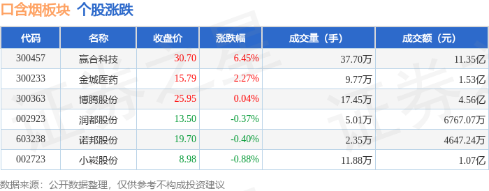 证券之星消息,1月23日口含烟板块较上一交易日上涨2.69%,赢合科技领涨。当日上证指数报收于4136.16,上涨0.33%。深证成指报收于14439.66,上涨0.79%。口含烟板块个股涨跌见下表: