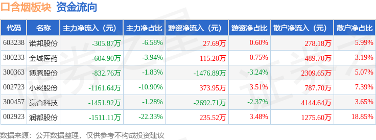 从资金流向上来看,当日口含烟板块主力资金净流出5868.21万元,游资资金净流出3417.25万元,散户资金净流入9285.46万元。口含烟板块个股资金流向见下表: