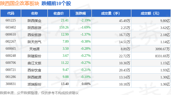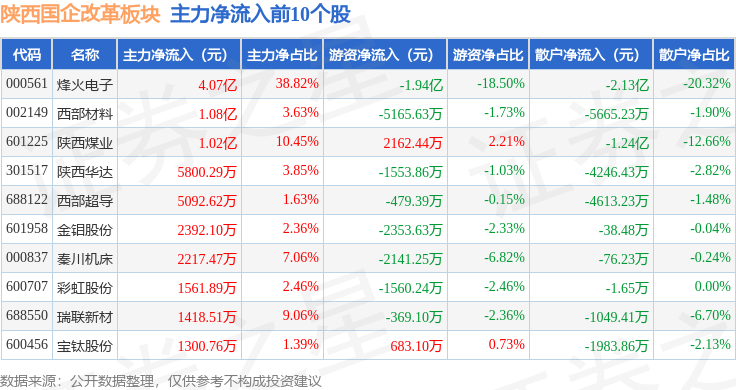 从资金流向上来看,当日陕西国企改革板块主力资金净流入6.62亿元,游资资金净流出3.44亿元,散户资金净流出3.18亿元。陕西国企改革板块个股资金流向见下表: