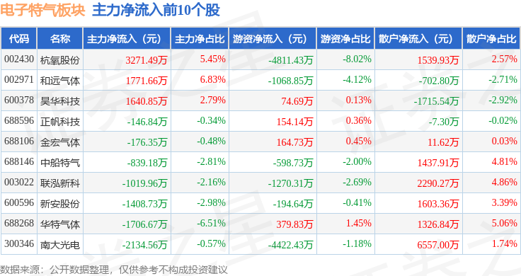 从资金流向上来看,当日电子特气板块主力资金净流出6.32亿元,游资资金净流入6319.64万元,散户资金净流入5.69亿元。电子特气板块个股资金流向见下表: